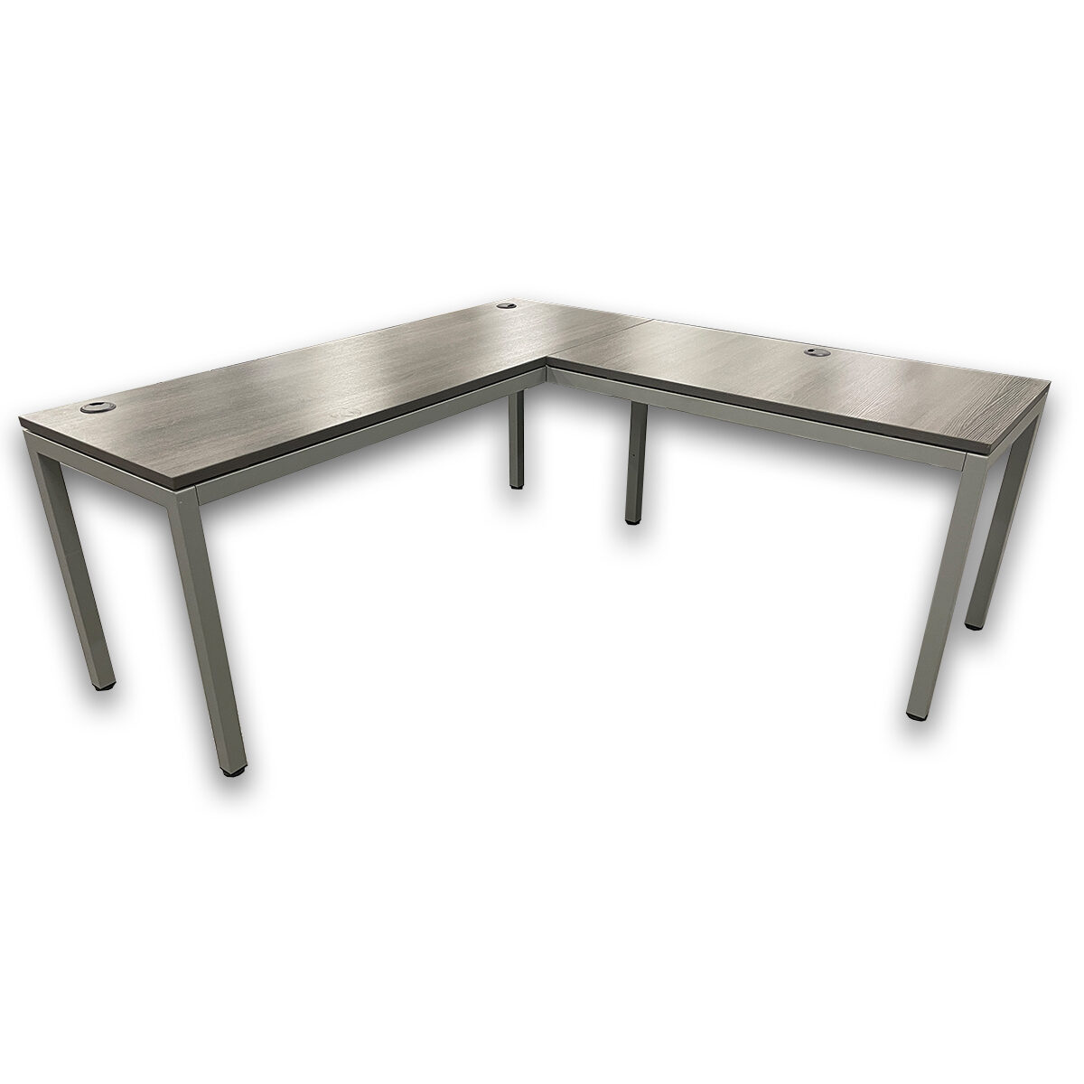 Used 71″ W L-Shape Desk W/ Metal Frame & Modesty – Grey Woodgrain
